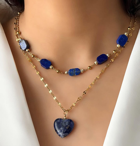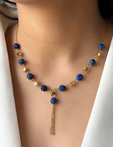 گردنبند دو لاین زنانه با سنگ اصل لاجورد رنگثابت